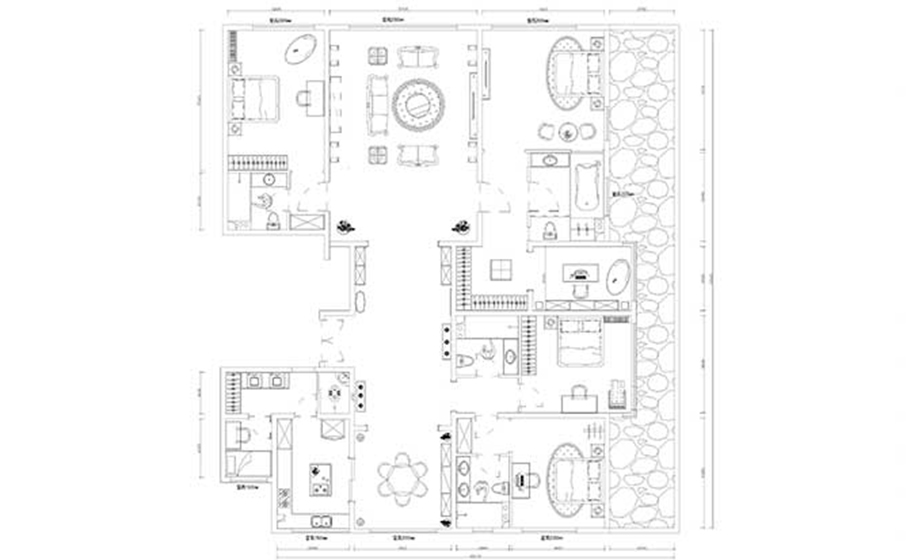 本案運用新中式風格,典雅高貴的特制詮釋出中國文化的神韻,客廳是整個案例的點睛之筆、淡黃的內置燈帶、做舊處理的地板、線條清晰、層次分明的吊頂、極強的空間對稱感;餐廳的設計圍繞著本風格的特質所展開,在用材上充分體現了風格特點,墻面淳樸但質感極強的真石漆,頂面醇厚的木梁造型頂,地面英朗又層次分明的拼貼處理,有中式的傳統格調又有新時代物質的點綴。