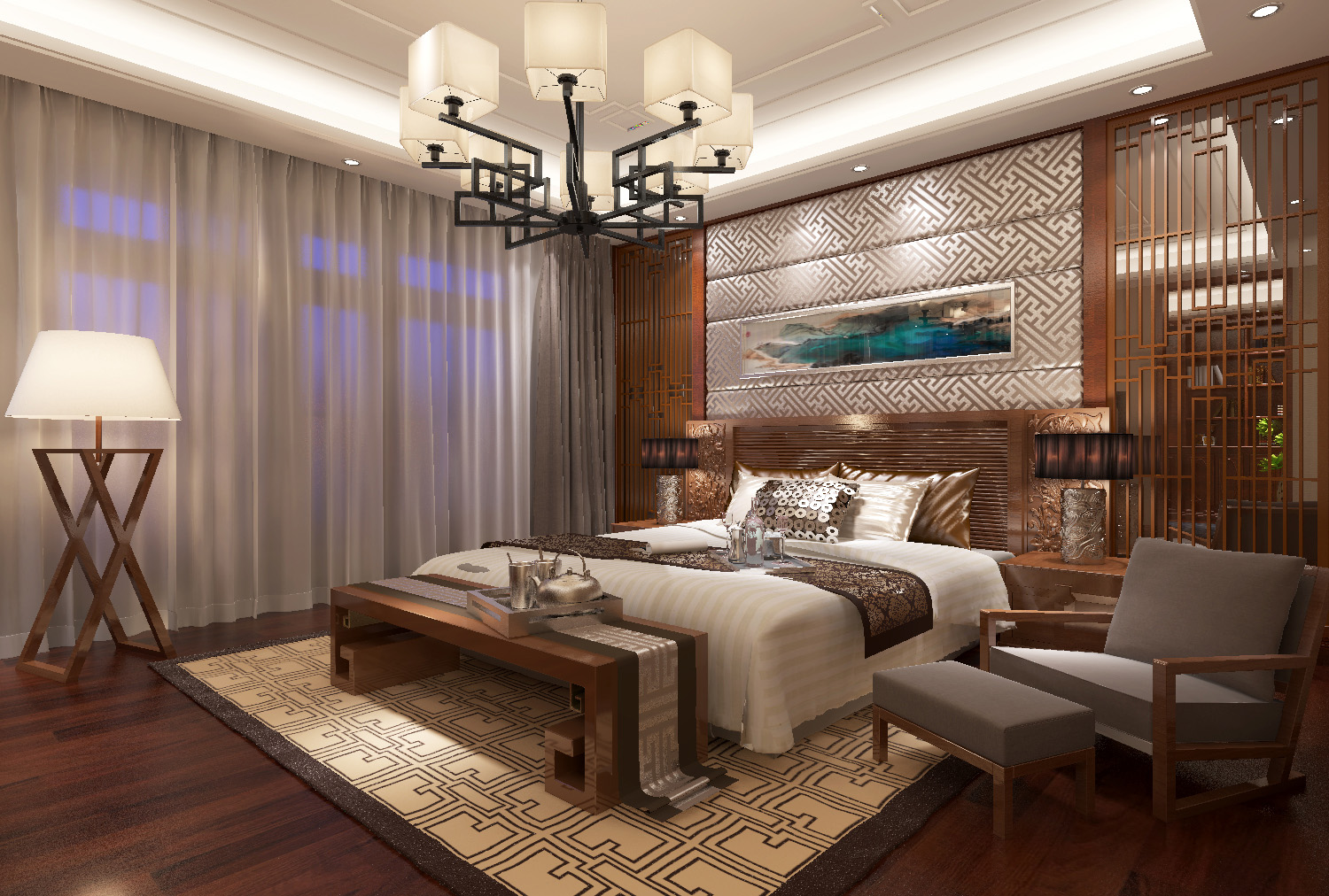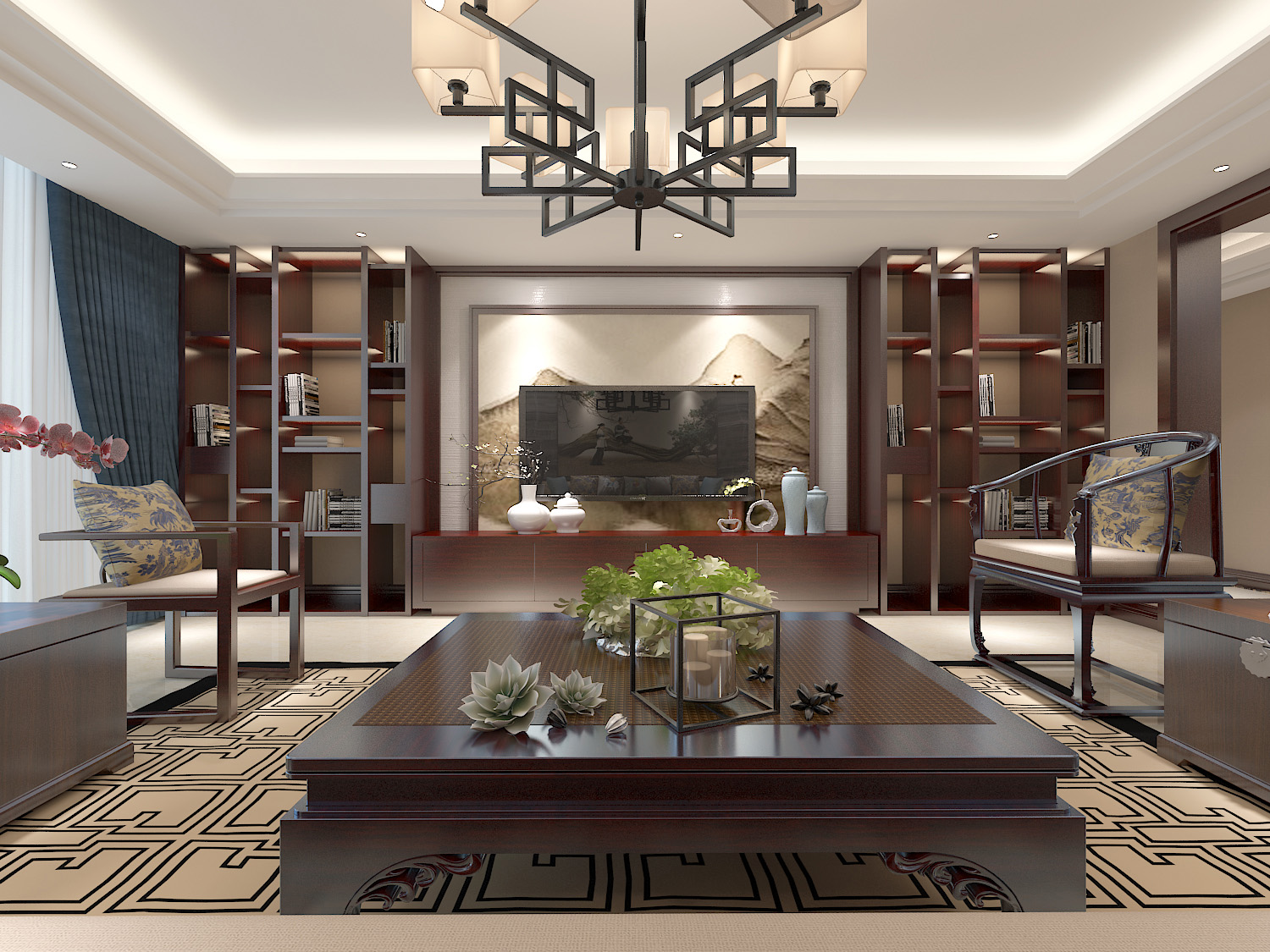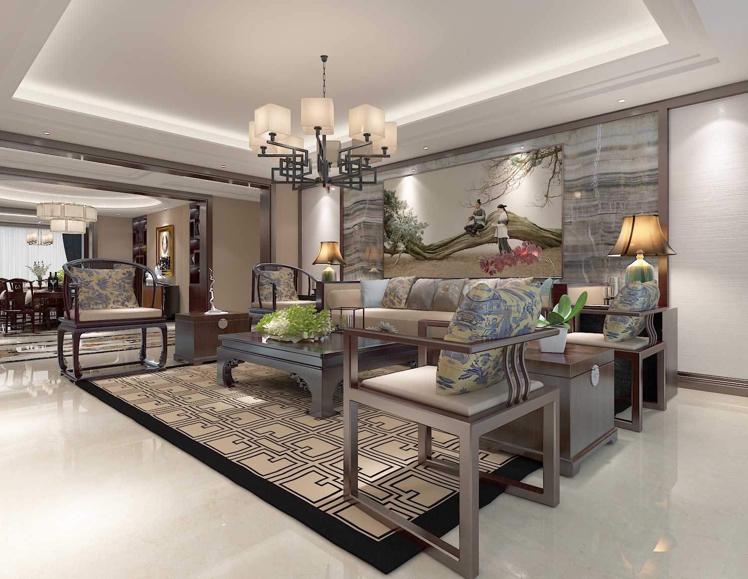 本案中的360平米的三居室整體采用了新中式風格裝修,新中式風格的設計不拘泥于傳統的中式元素,而是在繼承古典的基礎上融入現代的特色,將兩者有機地統一起來,作品表達出現代人對于中式風格低調沉穩的精神境界的追求。