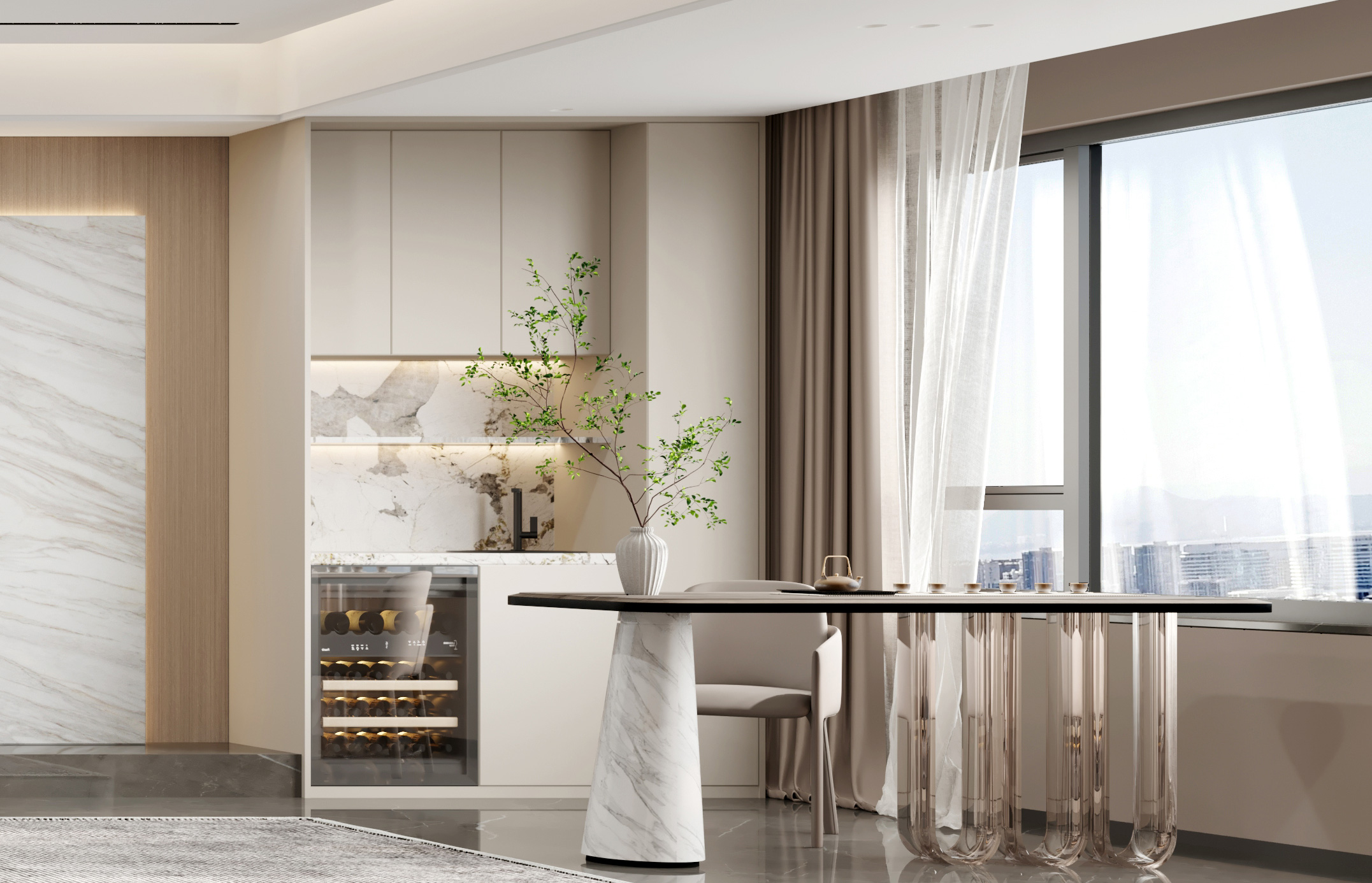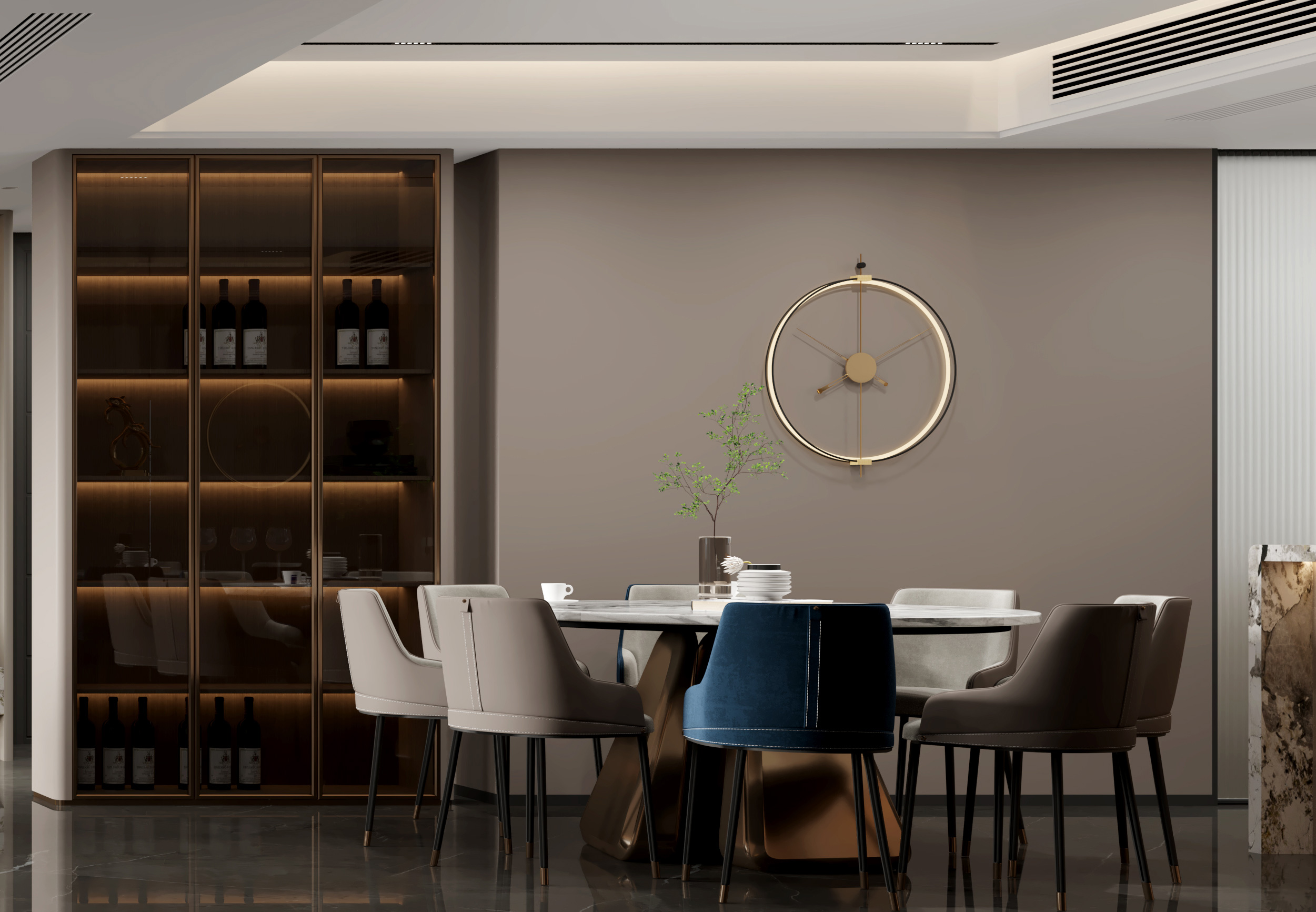 著重用空間處理的設(shè)計手法,來強調(diào)空間的靈活分割,以追求設(shè)計的幾何性和秩序感,空間線條簡約、流暢。