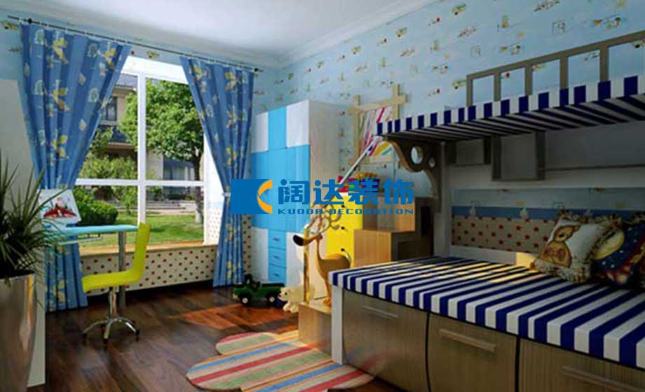 兒童房:以天藍色的整體色調(diào)和實木家具的搭配,給孩子營造出健康陽光的休閑和學(xué)習(xí)空間。