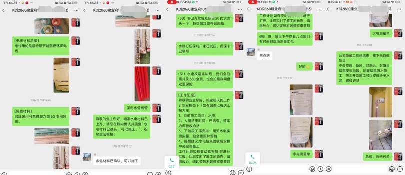 客戶、設計師、管家及水電師傅,現場確定水電位置,管家以文字加圖片形式發送至微信服務群,告知客戶今天交底的內容,待客戶確認后方可施工。